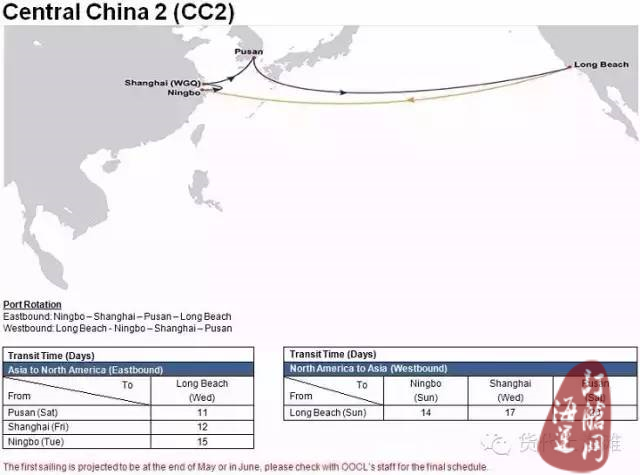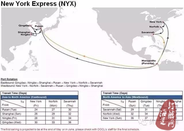 原NCE航线靠港次序为釜山、青岛、宁波、上海(洋山)、巴拿马运河、纽约、诺福克、萨瓦纳、巴拿马运河、釜山。