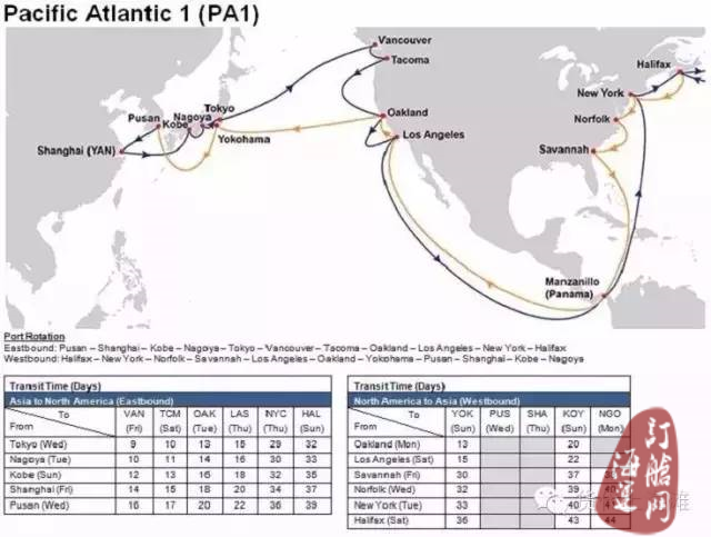 为提升链接亚、美、欧网络的船期可靠度,将提升PA1航线服务,靠港次序为釜山、上海(洋山)、神户、名古屋、东京、温哥华、塔科马、奥克兰、洛杉矶、巴拿马运河、曼萨尼约(巴拿马)、纽约、哈利法克斯、南安普敦、安特卫普、不来梅港、鹿特丹、哈利法克斯、纽约、诺福克、萨瓦纳、曼萨尼约(巴拿马)、巴拿马运河、洛杉矶、奥克兰、横滨、釜山。