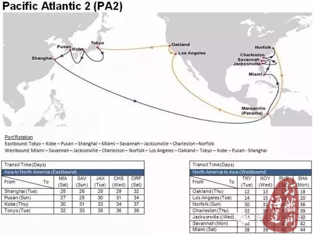 PA2航线服务将加靠上海,重点覆盖亚洲―大西洋中/南,以加强之间各港口连系。靠港次序为东京、神户、上海(洋山)、巴拿马运河、曼萨尼约(巴拿马)、迈阿密、萨瓦纳、杰克逊维尔、查尔斯敦、诺福克、曼萨尼约(巴拿马)、巴拿马运河、巴尔博亚、洛杉矶、奥克兰、东京。