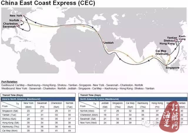加强CEC航线服务,将加靠高雄以扩大覆盖范围,靠港次序为高雄、香港、蛇口、盐田、新加坡、苏伊士运河、纽约、萨瓦纳、查尔斯敦、诺福克、苏伊士运河、吉达、新加坡、头顿市、高雄。