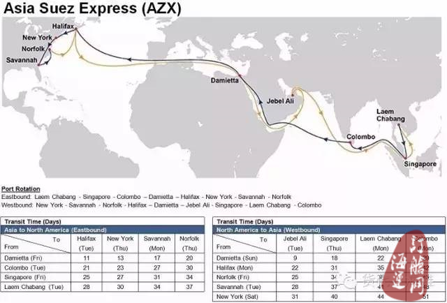 AZX航线及SVS航线靠港次序将维持不变。AZX航线挂靠林查班、新加坡、科伦坡、苏伊士运河、达米埃塔、卡利亚里、哈利法克斯、纽约、萨瓦纳、诺福克、哈利法克斯、卡利亚里、达米埃塔、苏伊士运河、杰贝阿里、新加坡、林查班。