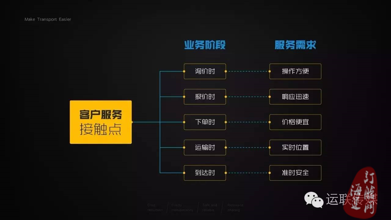 在请车过程中,客户的主要接触点:包括了询价、报价、下单、运输和到达这5个接触点。客户需要:询价更简便;报价更迅速;下单更便宜;运输更透明;到达更安全。