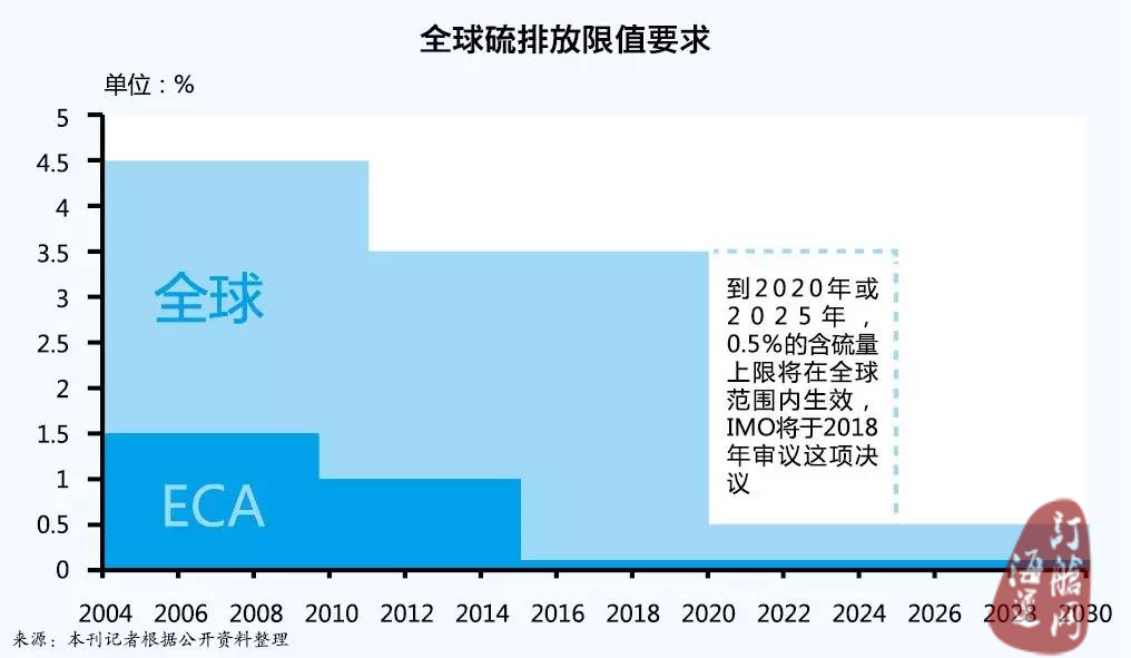 有报道称,如果全球硫限制在2020年实施,燃油成本保持在当前的低水平下,强制性要求改用低硫燃油意味着燃油成本将回升。如果到2020年,如一些机构预测,油价上涨接近70美元/桶,预计低硫燃油与残余燃料油之间的价格差异将增加400美元/吨。