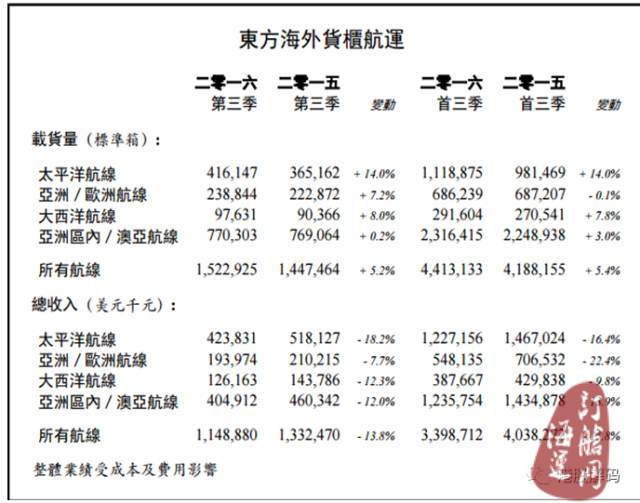 成本压力是航运业最难攻克的问题根据东方海外的季度公告,在2016年整个第三季度,公司的载货量提高了5.4%,其中主要是成立海洋联盟后载货量的增加。根据图表显示,东方海运的太平洋航线载货量增加较为明显,整个三季度增加14%,遗憾的是太平洋航线的总收入却下滑了16.4%,根据东方海运的陈述,业绩主要是受成本和费用的影响。
