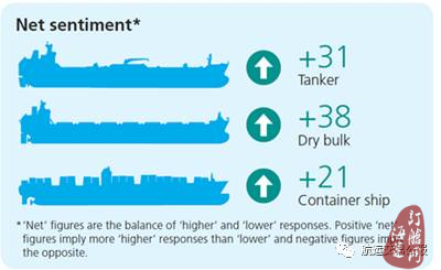 在主要的三大运输市场上,净市场情绪均为正面。油轮运输市场在+31没有变化,但干散货匀速市场从+49下降到+38,而集装箱运输运输市场则从+23下降到+21。