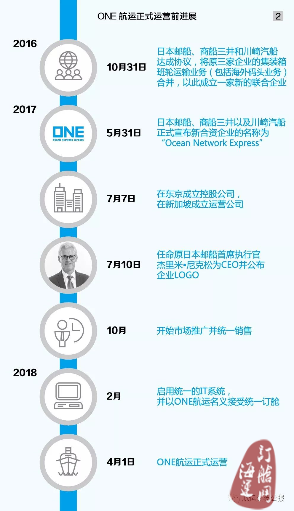 2016年10月31日,日本三家航运企业日本邮船、商船三井和川崎汽船达成协议,将原三家企业的集装箱班轮运输业务(包括海外码头业务)合并,以此成立一家新的联合企业。联合企业控股情况为:川崎汽船占比31%;商船三井占比31%;日本邮船占比38%。联合企业被命名为ONE航运。根据图2,ONE航运按照计划将于2018年4月1日正式运营。