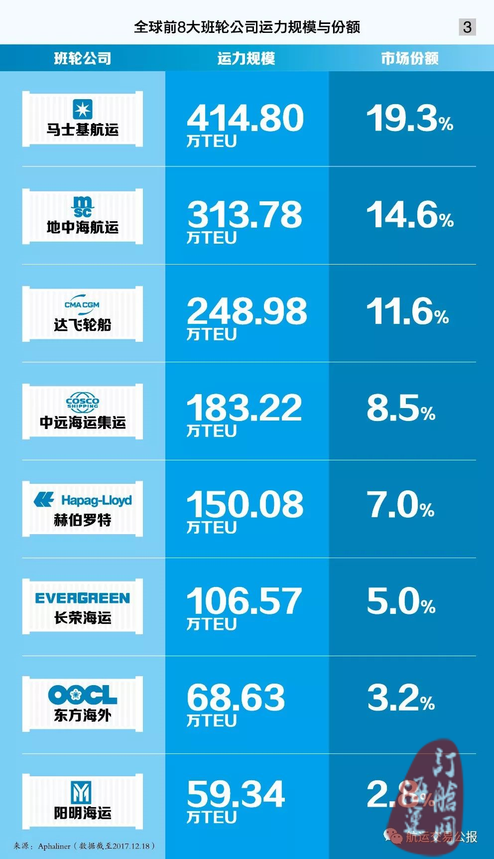 2017年4月1日,班轮市场2M、OCEAN Alliance和THE Alliance三大联盟正式开启运作。2M是由马士基航运、地中海航运,以及达成舱位合作的现代商船组成;OCEANAlliance由达飞轮船、中远海运集运、长荣海运和东方海外国际共同组建;THE Alliance由赫伯罗特、阳明海运、商船三井、日本邮船和川崎汽船共同组建。
