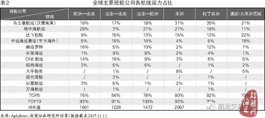 根据Aphaliner截至2017年11月1日的相关数据(见表2),浙商证券研究所估算在班轮市场完成现有并购事件之后,HHI为1076,市场将进入寡占型市场结构,为低寡占Ⅱ型。从航线的市场竞争结构看,非洲、拉丁美洲航线进入高寡占Ⅱ型;欧洲—北美、远东—欧洲、澳新/大洋洲航线进入低寡占Ⅰ型;远东—北美航线处在低寡占Ⅱ型。2018年,随着大量超大型集装箱船交付,远东—欧洲航线将朝着高寡占Ⅱ型发展,远东—北美航线将朝着低寡占Ⅰ型发展,行业结构继续优化,主干航线或将完成市场出清。